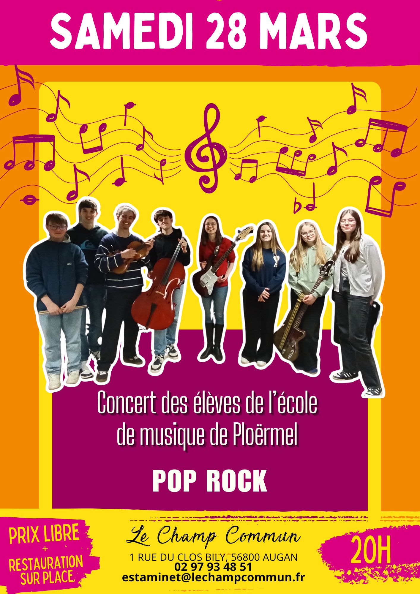 « Printemps du Rock » - Concert pop rock de l’école de musique Ploërmel Samedi 28 mars à 20h Champ Commun 56800 Augan