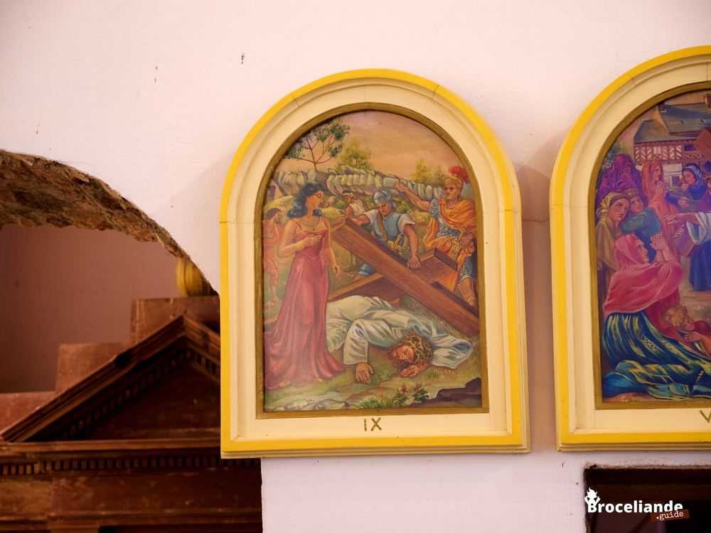 Douze stations du chemin de croix ont pour cadre Tréhorenteuc et le Val sans Retour. Les artistes eux-mêmes y sont représentés. Mais c’est la 9e station qui fit la célébrité du chemin : Jésus tombe pour la troisième fois aux pieds... de la fée Morgane, insolemment vêtue d’une très légère robe rouge. Ce tableau valut au père Gillard d’acerbes réactions des bien-pensants. Un quotidien régional titra : « À Tréhorenteuc, une pin-up dans un chemin de croix ».