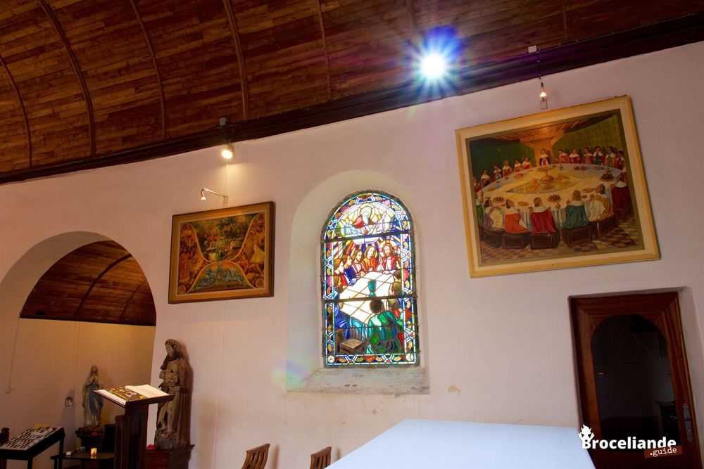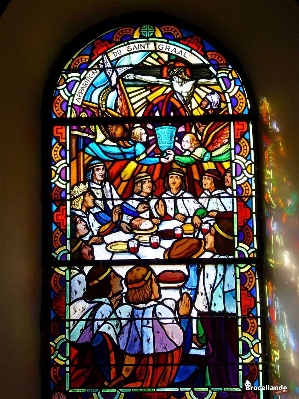 A la 13e station, Joseph d’Arimathie recueille le sang du Christ dans le Graal. Ce même Graal que l’on retrouve sur trois vitraux du chœur. Calice taillé dans une émeraude, il figure sur la table de la Cène, et apparaît dans sa gloire aux chevaliers de la Table Ronde, il rayonne enfin au centre du grand vitrail du chœur, au-dessus de Joseph d’Arimathie agenouillé devant Jésus et des symboles traditionnels des évangélistes. Au bas du vitrail, deux personnages représentent la famille Thétiot ; l’abbé Gillard reçut d’eux un héritage qu’il consacra à la réalisation de ce vitrail. Toujours dans le chœur, un tableau inspiré de diverses enluminures des XIVe et XVe siècles dépeint l’apparition du Graal aux chevaliers réunis autour de la Table Ronde. Écho du vieux mythe celtique du chaudron de fécondité et de vie, il remplit les assiettes de grasses volailles.