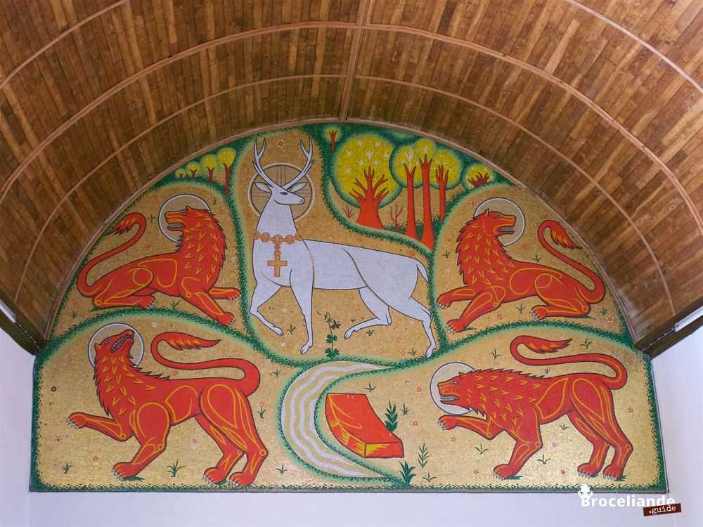 Dernière œuvre de l’église, la mosaïque du Cerf blanc au collier d’or, dessinée par Jean Delpech sur les indications de l’abbé Gillard, témoigne une ultime fois de la fusion entre la spiritualité chrétienne et l’esprit des vieux romans celtiques. Le Cerf blanc et les quatre lions rouges illustrent un épisode de la Quête du Graal où Galaad aperçoit ces animaux surnaturels qui se révèlent être Jésus et les évangélistes. Dans les textes arthuriens, le Cerf guide parfois les héros vers leur destin, comme il conduisait les âmes des défunts dans les anciennes religions. Et le décor nous ramène à Barenton, avec les arbres, le ruisseau, le perron de Merlin.