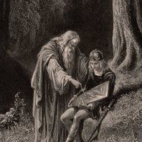 L’enchanteur Merlin naît de la tradition orale du Moyen-Âge. Puis il devient un héros de la grande fresque romanesque de la Quête du Graal écrite au 13e siècle. Conseiller incontournable des premiers rois chrétiens de Grande-Bretagne, il fait instaurer la Table Ronde, dresser les pierres de Salesbières, ou encore établir la royauté d’Arthur en usant de sortilèges surprenants. Énigmatique et charismatique, il détient du diable qui l’a fait naître le pouvoir de connaître le passé, et de Dieu qui l’a racheté par le baptême celui de déchiffrer l’avenir. Maléfique et divin, il ne cesse de dérouter ceux qui l’approchent en usant de ses pouvoirs de transformation et de divination. Il apparaît sous une forme, disparaît, revient sous une autre... Il prédit la naissance et la mort, la défaite et la victoire. Sur son conseil, les rois agissent comme de simples marionnettes.