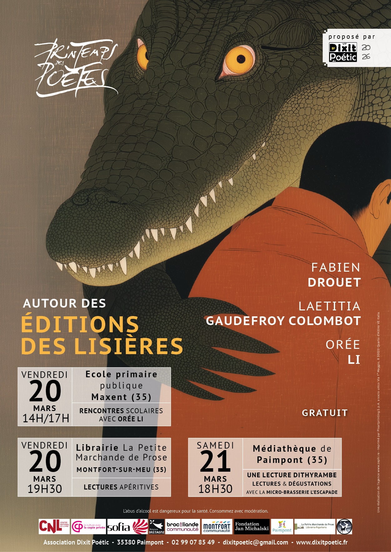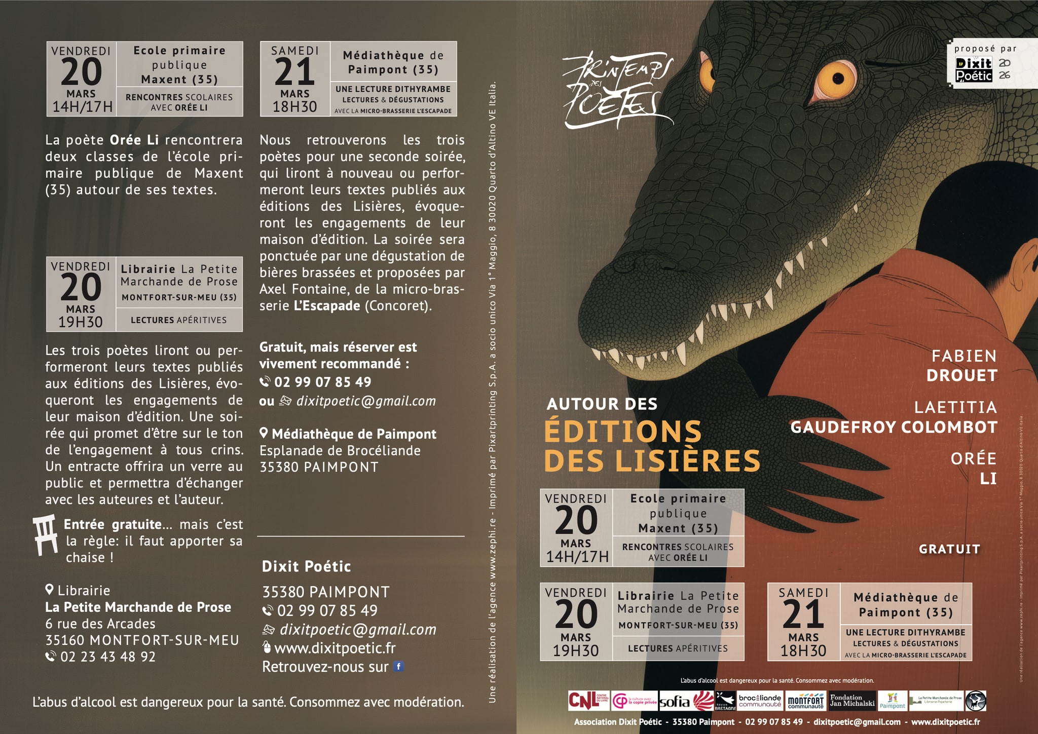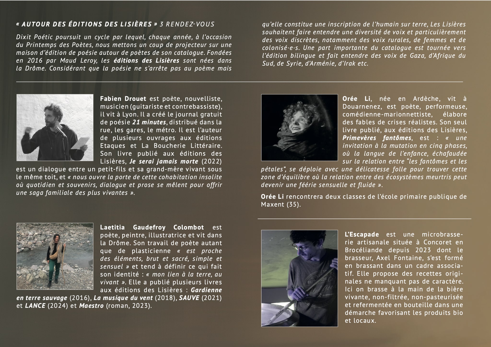 Dixit Poétic participe à l’évènement national « le Printemps de Poètes » et présente les Éditions des Lisières à travers 3 poètes : Fabien Drouet, Laetitia Gaudefroy Colombot et Orée Li.