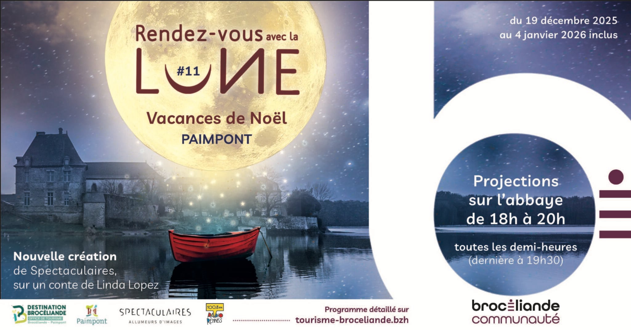 La lune vous accueille tous les soirs pour une projection exceptionnelle sur les murs de l’Abbaye de Paimpont. Rendez-vous de 18h à 20h (Projection toutes les 30 minutes.) !